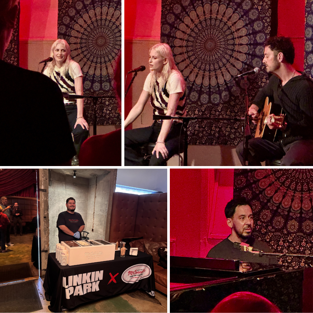 What a treat it was to be in attendance for an acoustic performance and Q&A with Linkin Park at East West Studios. Band members Emily Armstrong, Colin BrittainBrad Delson, and Mike Shinoda were on hand, taking time off from their From Zero tour, to discuss the long journey back from losing lead singer Chester Bennington to suicide in 2017, to discovering a new sound with Emily, recording a new album, and triumphantly returning to the road with their sold-out world tour. The American leg of the From Zero tour wraps up tonight in Seattle, and then it's off to South America!